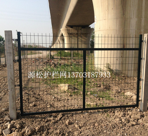 鋼筋混凝土立柱金屬網(wǎng)片防護柵欄可采用單開門或雙開門兩種形式。單開寬度1.5m,雙開寬度3m,其網(wǎng)片形式與防護柵欄保持一致,并通過銷鈾、銷鈾套與立柱連接。