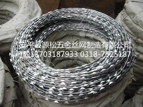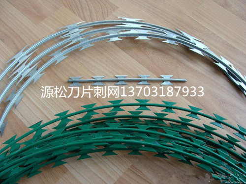 刀片刺網(wǎng)又名刮刀型刺絲,是一種近年發(fā)展起來的防護、隔離能力較強的新型防護網(wǎng)產品。它采用鋼板沖壓成型包附于鋼絲(筋絲)之上,由銳利尖角鍍鋅鋼板或不銹鋼薄板做刀片,高張力鋼絲做芯線組合而成的。鋒利的刀型刺由雙線扣裝后成蛇腹狀,既美觀又讓人不寒而栗。起到了很好的阻嚇作用。
