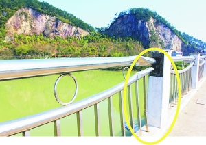 麗口市區(qū)溪口大橋上的很多不銹鋼護(hù)欄網(wǎng)損壞了遍體鱗傷。左右護(hù)欄共有88個(gè)圓環(huán)遭損壞,東西側(cè)護(hù)欄分別是11個(gè)和77個(gè)遭損壞。不銹鋼護(hù)欄上還有幾處彎曲、凹陷,應(yīng)該是碰撞后留下的痕跡。此外,在西側(cè)行車(chē)方向末端的護(hù)欄上,有一根石柱已經(jīng)不見(jiàn)了,只留下一個(gè)根部,露出鋼筋接頭。雖然都是一些小損壞,看似不影響行車(chē)和行人安全,但看著傷痕累累的大橋,總讓人感覺(jué)不是滋味。